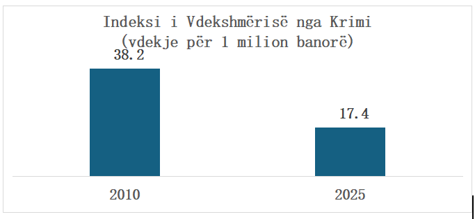 Vdekshmëria nga krimi ka qenë 2.2 herë më e lartë më 2010, krahasuar me 2025. Shihni grafikun e mëposhtëm për indeksin e vdekshmërisë nga krimi (vdekje nga krimi për 1 milion banorë).
