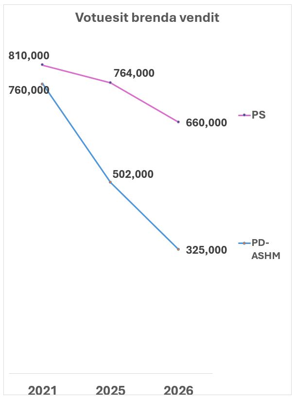 Duke përmbledhur, PD-ASHM ka sot rreth 435 mijë votues më pak brenda vendit se sa më 2021. Ndërsa PS ka vetëm 150 mijë më pak. Si rezultat, epërsia e PS-së është rritur nga rreth 50 mijë brenda vendit më 2021, në rreth 335 mijë sot.
