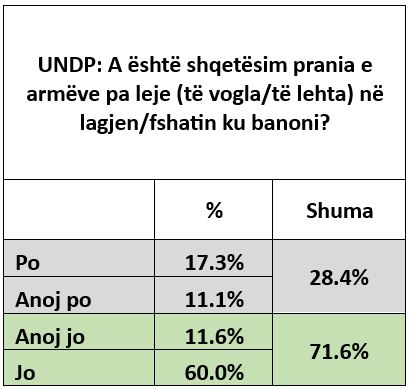 Edhe një armë e vetme pa leje mund të bëhet shkak i një vdekje apo plagosje të rëndë, por rezultatet e sondazhit të mësipërm tregojnë se mbizotëron një opinion pozitiv në popullsi rreth kësaj çështje.