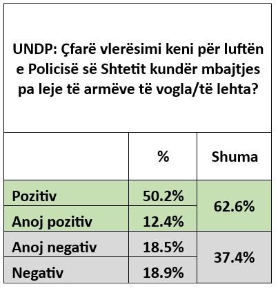 Plot 62.6% e të anketuarve anojnë nga vlerësimi pozitiv për luftën e Policisë së Shtetit kundër armëmbajtjes pa leje; 50.2% pozitiv dhe 12.4% anojnë pozitiv (shihni tabelën më poshtë). Nga një ekstrapolim i përafërt statistikor, rezulton se rreth 1.28 milionë banorë të rritur gjithsej anojnë nga vlerësimi pozitiv.