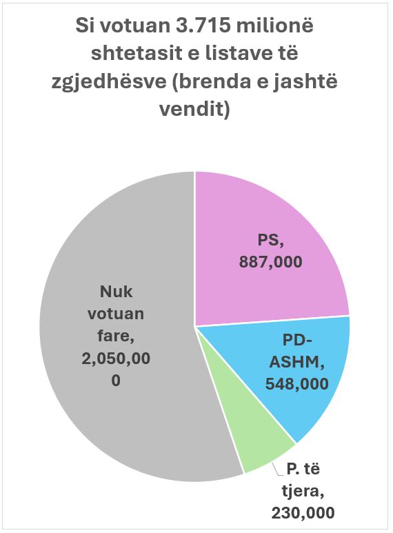 Ndër ata që e morën mundimin të votojnë (brenda e jashtë vendit), rreth 887 mijë votuan për PS dhe rreth 548 mijë për PD-ASHM (rreth 51 mijëve prej tyreve u rezultoi vota e pavlefshme, ngaqë u ngatërruan me fletët e votimit si fletë gazete…). Me fjalë të tjera, më pak se 2/5 e 3.715 milionëve në listat e zgjedhësve votuan për PS dhe PD-ASHM!