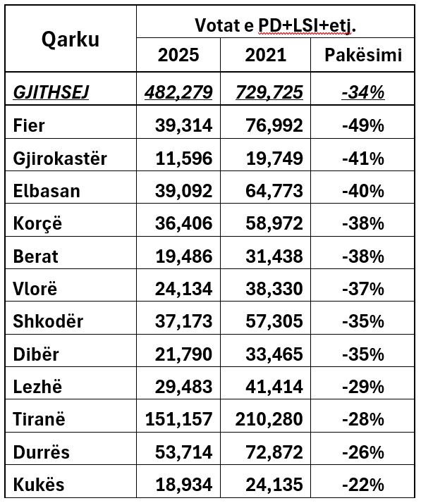 Brenda vendit, PS-ja mori më 11 maj plot 34 mijë vota më pak se më 2021, ose 95.5% të votave të atëhershme. Por nga ana tjetër, partitë përbërëse të koalicionit PD-ASHM (PD+LSI+etj.) pësuan një rënie shumë dramatike – ato morën pothuaj 250 mijë vota më pak se më 2021, ose vetëm 66% të votave të atëhershme.