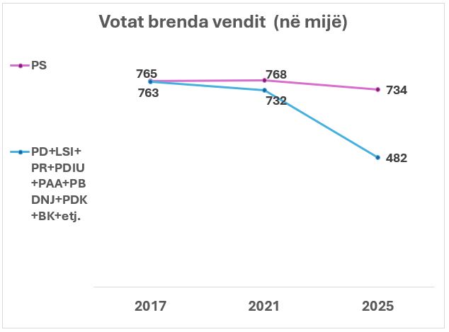 Qysh prej 2017-ës, PS-ja në pushtet ka garuar e vetme në zgjedhjet parlamentare, përballë disa partive kryesore opozitare (PD, LSI, PR, PDIU, PAA, PBDNJ, PDK, BK etj). Duke mbledhur votat e partive kryesore opozitare, konstatohet se epërsia e PS-së ndaj tyre si grup ishte modeste më 2017 dhe më 2021, por PS-ja siguroi plot 74 mandate parlamentare në të dyja zgjedhjet falë përthyerjeve të sistemit tonë elektoral rajonal.