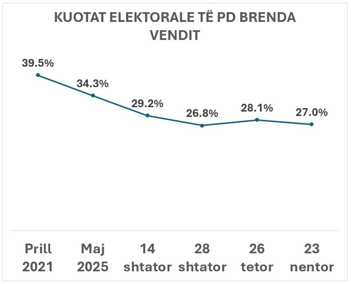 Në fakt, në sondazhin e përjavshëm që kam kryer, unë e kam matur në vazhdimësi këtë rënie. Duke ndërthurur rezultatet e sondazhit me rezultatet zyrtare të zgjedhjeve në prill 2021 dhe maj 2025, ndërtova grafikun e mëposhtëm, që ilustron rrëshqitjen e pandalshme të kuotave elektorale të PD-së qysh nga prilli 2021.
