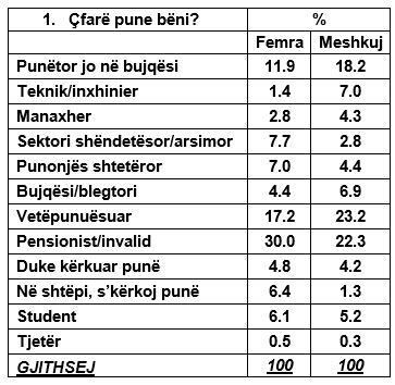 Vetëm në zërat “Sektori shëndetësor/arsimor” dhe “Punonjës shtetëror”, përqindja e punësimit është më e lartë te femrat se sa te meshkujt (shihni Tabelën 1).