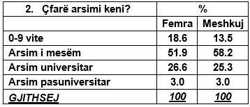 Sa i përket nivelit arsimor, diferenca mes grave dhe burrave është e papërfillshme statistikisht (70.4% vs. 71.7% kanë kryer vetëm 0-12 vjet shkollë - shihni Tabelën 2).