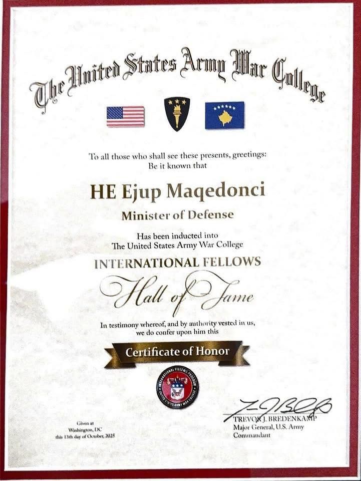Një arritje historike dhe një nder i jashtëzakonshëm për shtetin e Kosovës dhe gjithë kombin shqiptar. Ministri i Mbrojtjes së Kosovës, Gjeneral Ejup Maqedonci, është përfshirë në “Hall of Fame” të U.S. Army War College, duke u bërë kështu gjenerali i parë shqiptar që merr këtë vlerësim të lartë nga një prej institucioneve më prestigjioze ushtarake në botë.