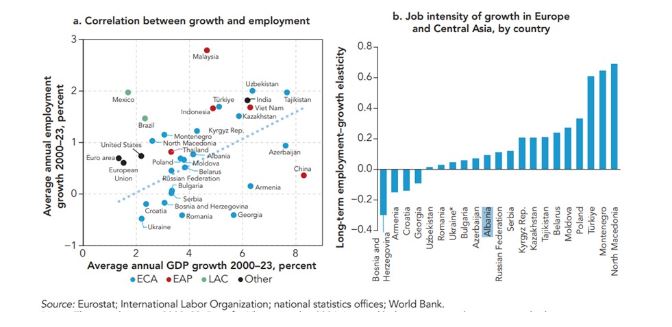 Banka ka evidentuar se ekonomia shqiptare po rritet, por jo në mënyrë mjaftueshme për të punësuar më shumë njerëz. Për ta përmirësuar këtë, duhet që rritja të vijë nga sektorë që gjenerojnë më shumë punësim si prodhimi, shërbimet profesionale, teknologjia dhe industria përpunuese.