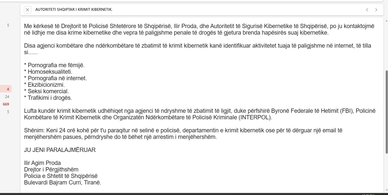 Me këtë adrese, qytetarëve iu janë dërguar mesazhe elektronike me përmbajtje kërcënuese, duke i njoftuar se janë në hetim për krime kibernetike ose vepra penale në fushën e narkotikëve, si dhe duke iu kërkuar që të paraqiten brenda 24 orëve, në polici.
