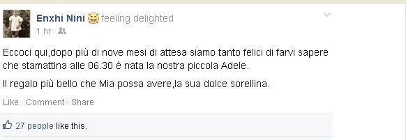 Nëpërmjet një statusi në profilin e saj në Facebook ajo ka shkruar: “Pas 9-muajsh pritje jemi shumë të lumtur t’iu themi që mëngjesin e sotëm në orën 06:30 lindi vogëlushja jonë Adele. Dhurata më e bukur që Mia mund të kishte, motrën e saj të ëmbël”,- ka shkruar në gjuhën italiane Nini.