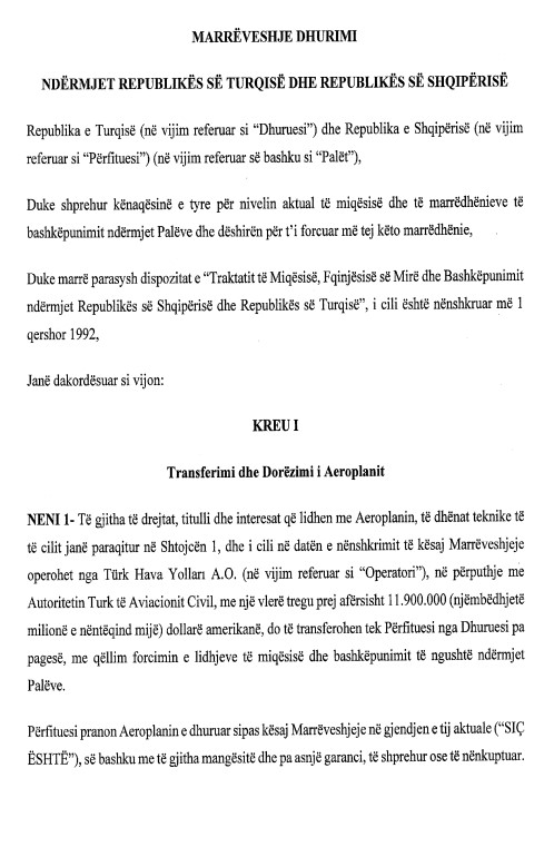 Po ashtu, në marrëveshje thuhet se Forcat e Armatosura të Republikës së Shqipërisë janë përgjegjëse për çështjet teknike, administrative dhe buxhetore lidhur me Aeroplanin. “Për të shmangur çdo paqartësi, Aeroplani nuk do të përdoret për qëllime ushtarake nën asnjë rrethanë”, thuhet në marrëveshje.