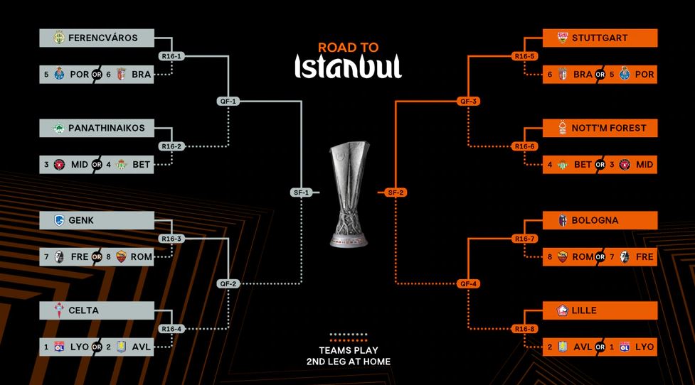 Në bazë të ndarjes sipas rrugëtimit për në finalen e Stambollit, klubet kanë mësuar edhe kundërshtarët e mundshëm. Shembull: Ferencvaros do përballet në fazën e 1/8-ave me njërën mes Portos ose Bragës, rivalë që mund të jenë edhe për Stuttgartin.