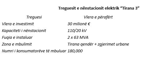 Nënstacioni “Tirana 3”, i cili përmban punimet ndërtimi i nënstacionit të ri, në një zonë jeshile që nuk ka pasur nënstacion më para dhe me tre linja 110 kV që dalin nga këtu dhe lidhen me nënstacionin e Traktorave, nënstacionin e Selitës dhe nënstacionin e Farkës. Ky investim është shumë i rëndësishëm për sigurinë energjetike të Tiranës pasi krijon një lidhje unazore me pjesë të tjera të nënstacioneve të Tiranës. Investimi është një bashkëpunim me bankën shtetërore gjermane KfW.