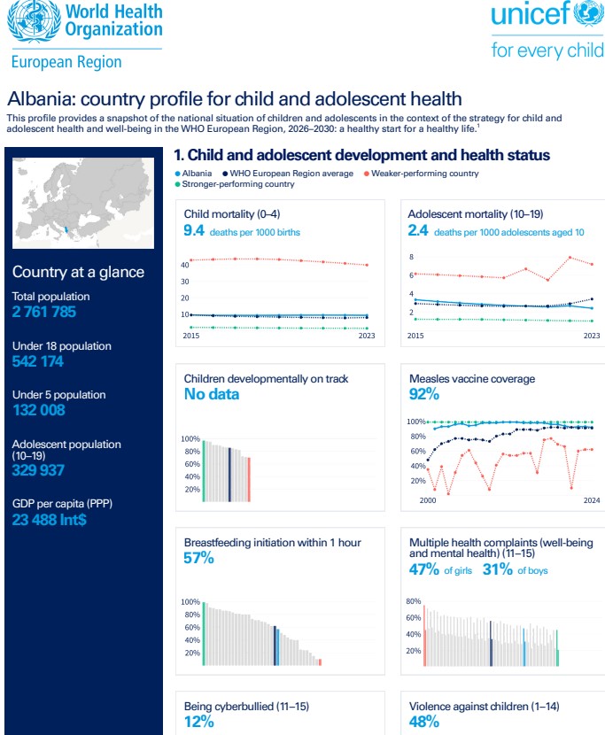 Raporti për Shqipërinë i përgatitur në kuadër të Strategjisë së OBSH-së për Shëndetin dhe Mirëqenien e Fëmijëve dhe Adoleshentëve 2026-2030, evidenton se vdekshmëria foshnjore mbetet shqetësuese: 9.4 për 1,000 lindje të gjalla për grupmoshën 0-4 vjeç, por edhe ajo te adoleshtentët, 2.4 për 1,000 banorë për adoleshentët 10-19 vjeç. Në Shqipëri thotë OBSH jetojnë 542 mijë e 174 fëmijë nën moshën 18 vjeç.
