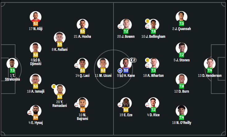 Shqipëria humbi 0-2 kundër Anglisë në "Air Albania", sfidë kjo e fundit për Grupin K kualifikues të Kupës së Botës 2026. Më i miri i ndeshjes padyshim ishte Harry Kane që shënoi dy gola, me "SofaScore" që e vlerësoi me notën 9,0.