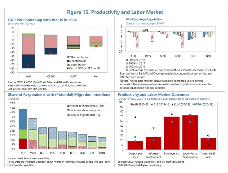 “Ky nivel i lartë i gatishmërisë për emigrim, krahasuar me vendet e tjera të Europës Qendrore dhe Lindore, sugjeron një mungesë besimi në perspektivat ekonomike dhe sociale në vend, si dhe dobësi të tregut të punës për të ofruar mundësi cilësore dhe të qëndrueshme” referoi FMN.
