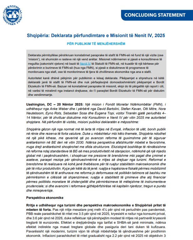 Ekonomia e Shqipërisë ka një prej rritjeve më të larta në Evropë, duke mbështetur edhe rrugën drejt anëtarësimit të vendit në BE. Kështu nis deklarata e Fondit Monetar Ndërkombëtar në mbyllje të misionit 2 javor në Shqipëri, në të cilën ka një sërë rezervash që mund të cenojnë këtë ecuri pozitive, nga produktiviteti i ulët, tek presionet për rritjen e pagave apo përqendrimi i ekonomisë në turizëm.