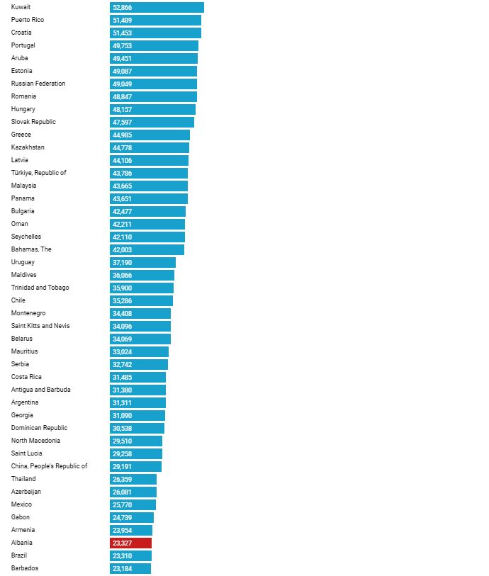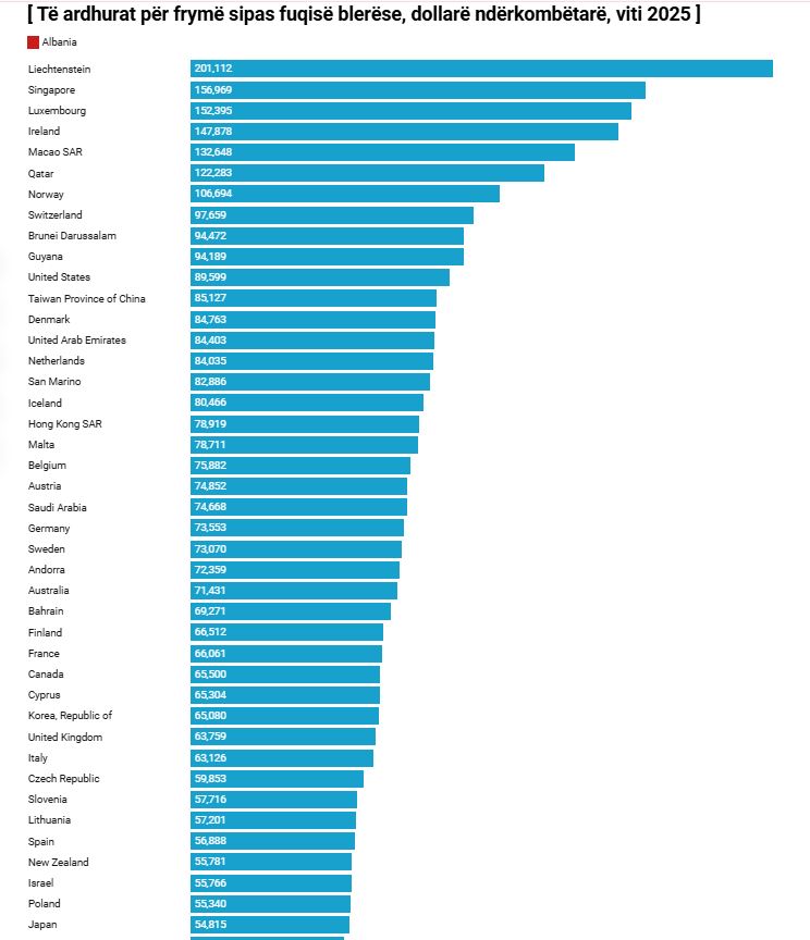 Shqipëria renditet e 83-ta në botë për të ardhurat për frymë në dollarë dhe e 85-ta në treguesin tjetër më të rëndësishëm, të ardhurat për frymë sipas standardit të fuqisë blerëse, për vitin 2025.