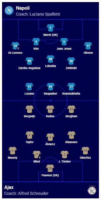 Në Napoli, vendasit luajnë me Ajax. Të parët në klasifikim, djemtë e Spallettit kërkojnë diktatin. Nga ana tjetër Ajax kërkon të marrë hak për humbjen e javës së shkuar. Në grupin A Napoli prin me 9 pikë, Liverpool me 6, Ajax me 3 dhe Rangers me zero pikë. Në Skoci në 21:00 luan Rangers me Liverpool.