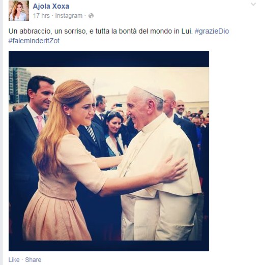 “Përqafimi më i mirë në jetën time” , kështu e ka përkufizuar bashkëshortja e ministrit të Mirëqënies Sociale  dhe Rinisë Erion Veliaj, Ajola Xoxa takimin dhe përqafimin me Papa Franceskun.