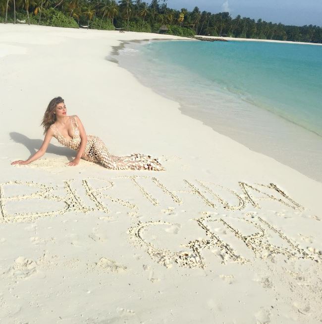 Të dy kanë ngrënë një darkë romantike mbi rërën e bardhë, të rrethur nga qirinj dhe trëdafila. 30-vjeçarja ka publikuar foto në Instagram duke mbajtur një buqetë me lule në dorë, e veshur me një fustan të shkurtër që i ekspozonte këmbët e gjata.