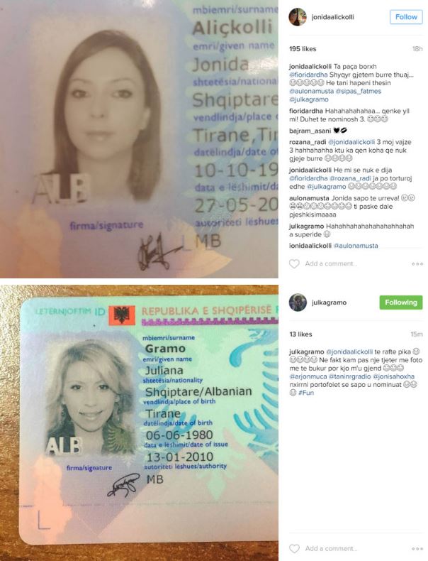 Duket se pikërisht këtu ka lindur dhe loja më e fundit ndërmjet disa personazheve të njohur shqiptare. Gjithçka ka filluar me Rozana Radin, e cila siç e theksoi dhe vetë “hapi vallen e lojës së kartave të identitetit”, duke postuar fillimisht të vetën dhe më pas duke nominuar edhe të tjerë, dhe kështu vazhdoi zinxhiri. Jo të gjithë iu përgjigjën apelit, por ka dhe nga ata që e bënë. Foto të cilat përbënin dhe përjashtime nga çfarë kemi parë deri tani, me Julkën dhe Fiorin të cilat kanë pozuar pak më të buzëqeshura. E ndërsa Rozana e filloi lojën thjesht me fotot, Julka dhe Bes Kallaku i bënë një foto më të plotë letërnjoftimeve duke zbuluar edhe më shumë info nga dokumenti i tyre. Veçanërisht për Besin, një “katunar dhe loki” i vetëdeklaruar zbuluam që ka lindur në Tiranë, çka shkaktoi komente simpatike edhe nga fansat e tij. /intv/