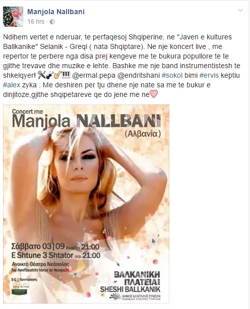 Ka qenë vetë artistja që e ka ndarë këtë lajm me ndjekësit e saj në rrjetet sociale, ku këto të fundit nuk i kanë kursyer komentet me superlativa për Nallbanin. “Ndihem vërtet e nderuar të përfaqësoj Shqipërinë në “Javën e Kulturës Ballkanike” Selanik, Greqi (nata shqiptare).