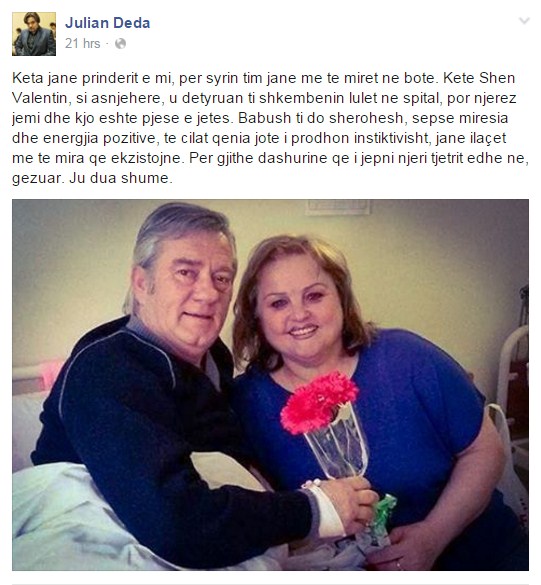 “Këta janë prindërit e mi, për syrin tim janë më të mirët në botë. Këtë Shën Valentin, si asnjëherë, u detyruan t’i shkëmbenin lulet në spital, por njerëz jemi dhe kjo është pjesë e jetës. Babush, ti do shërohesh, sepse mirësia dhe energjia pozitive, të cilat qënia jote i prodhon instiktivisht, janë ilaçet më të mira që ekzistojnë. Për gjithë dashurinë që i jepni njëri tjetrit edhe ne, gezuar. Ju dua shumë.”