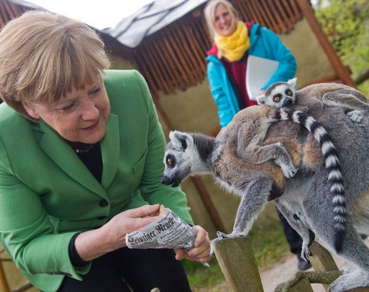 Kancelarja gjermane Angela Merkel është fotografuar në hapjen e sezonit të “Bird Park” në Marlow, kur një lemur i ka kërcyer në shpatull.