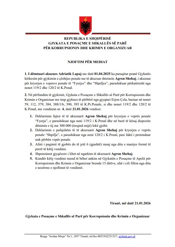 Gjykata e Posaçme dënoi këtë të mërkurë me 300 mijë lekë (të reja) gjobë Agron Shehajn, kreun e partisë “Mundësia”. Dënimi u vendos për fyerjen e kreut të 'Shqipëria Bëhet' Adriatik Lapaj, ndërsa u shpall i pafajshëm për 'shpifje'.