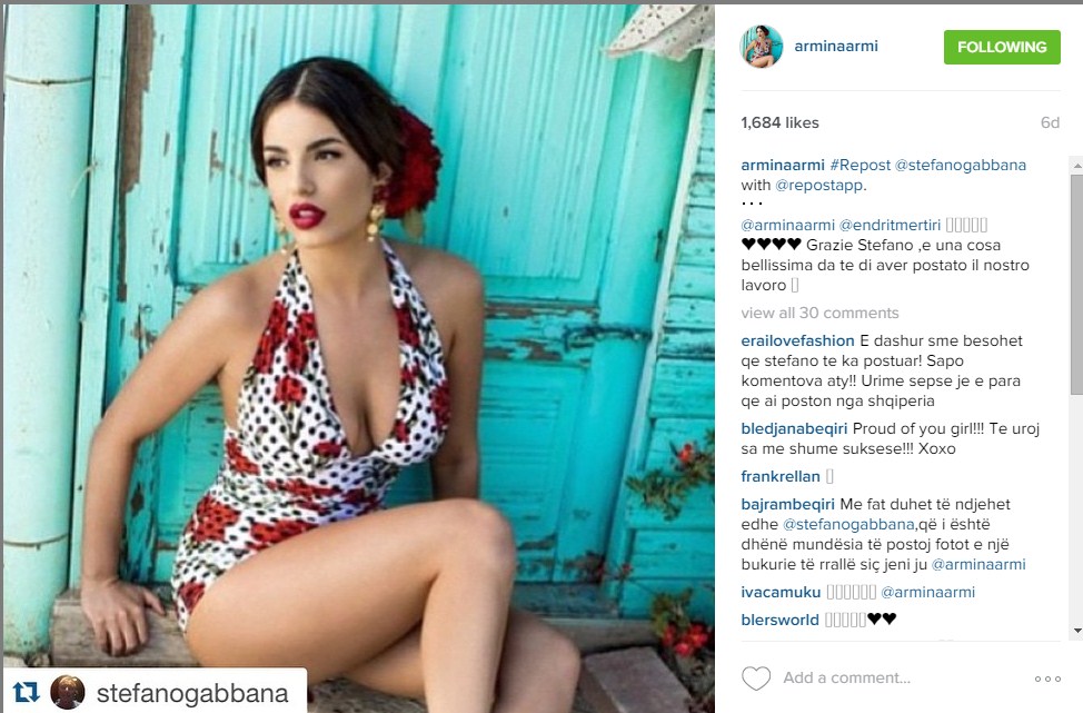 Në setin e fundit fotografik të realizuar nga Endrit Mërtiri, Armina Mevlani shfaqet seksuale dhe diçka të tillë e ka vënë re edhe stilisti i njohur Stefano Gabbana.