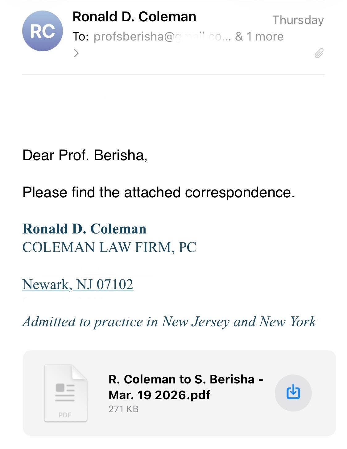 Në Facebook, Kokalari ka postuar foton e kërkesës së dërguar në emailin zyrtar të Sali Berishës nga avokati amerikan Ronald D. Coleman më 19 mars.
