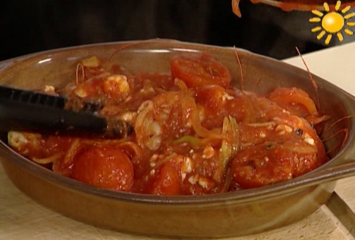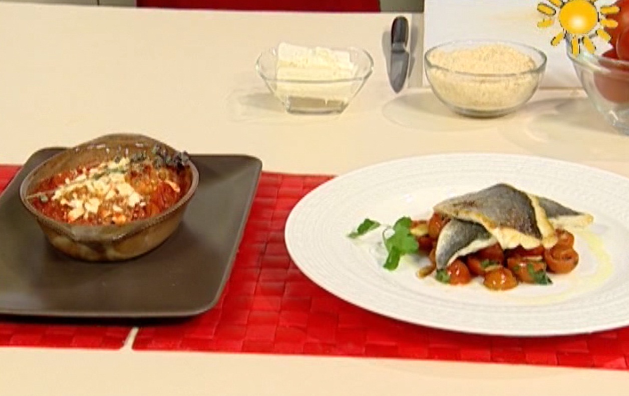 Dy receta erdhën në këndin e kuzhinës. Peshku koc me domate dhe karkalec të furrës me djathë të bardhë.