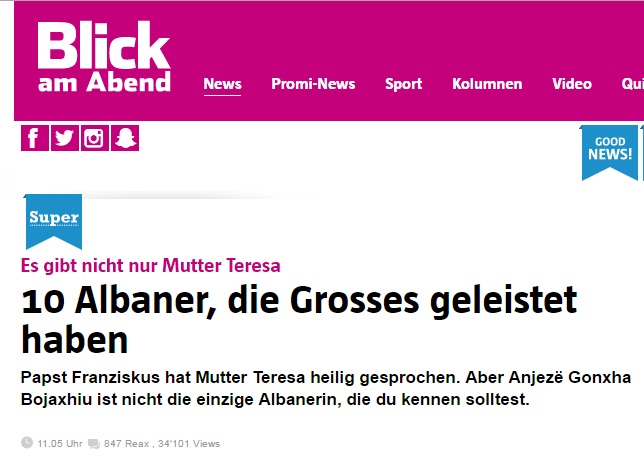 Nuk është vetëm Nënë Tereza. Ka edhe 10 shqiptarë të tjerë që kanë bërë gjera të mëdha. Kështu e nis shkrimin suplimenti “Am Abend” e së përditshmes zvicerane “Blick”.