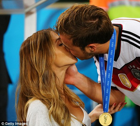 Protagonisti i skuadrës gjermane 22-vjeçari Mario Goetze është mbuluar menjeherë nga përqafimet dhe puthjet e të dashurës së tij modele Ann- Kathrin Brommel.