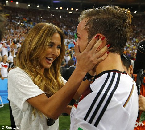 Protagonisti i skuadrës gjermane 22-vjeçari Mario Goetze është mbuluar menjeherë nga përqafimet dhe puthjet e të dashurës së tij modele Ann- Kathrin Brommel.