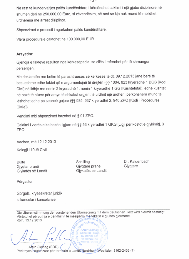 Nëse ai  vazhdon me akuzat e tij të gabuara ndaj kompanisë muzikore “Acromax” do të jetë i detyruar të paguajë edhe 250 000 euro të tjera ose në rast të kundërt do të kryejë burg.