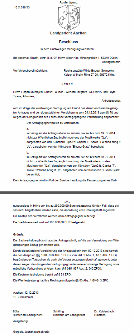 Ky ka qenë vendimi i marë ditën e djeshme nga Gjykata e Landit te Aachenit ne Gjermani, pas ankesave që Flori Mumajesi ngriti në lidhje me këngën “Qaj” dhe këngën “I Wanna Bring It Up” kundra Arkiva Shqip.