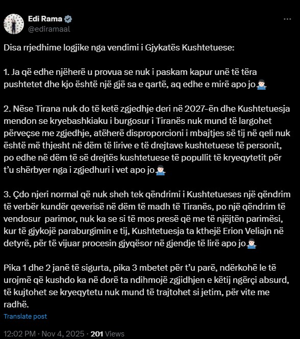 “Çdo njeri normal që nuk sheh tek qëndrimi i Kushtetueses një qëndrim të verbër kundër qeverisë në dëm të madh të Tiranës, po një qëndrim të vendosur parimor, nuk ka se si të mos presë që me të njëjtën parimësi, kur të gjykojë paraburgimin e tij, Kushtetuesja ta kthejë Erion Veliajn në detyrë, për të vijuar procesin gjyqësor në gjendje të lirë apo jo", shkruan Rama.