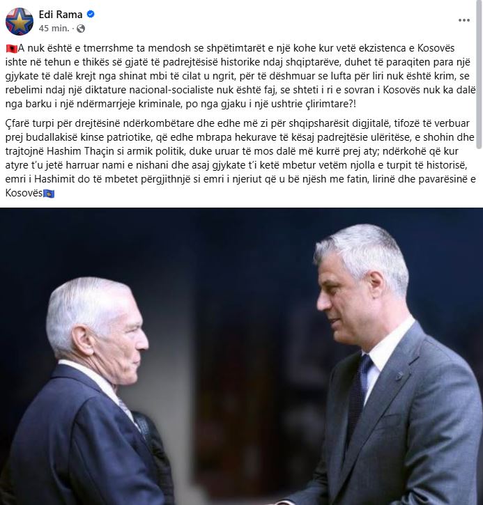 “Çfarë turpi për drejtësinë ndërkombëtare dhe edhe më zi për shqipsharësit digjitalë, tifozë të verbuar prej budallakisë kinse patriotike, që edhe mbrapa hekurave të kësaj padrejtësie ulëritëse, e shohin dhe trajtojnë Hashim Thaçin si armik politik, duke uruar të mos dalë më kurrë prej aty; ndërkohë që kur atyre t’u jetë harruar nami e nishani dhe asaj gjykate t’i ketë mbetur vetëm njolla e turpit të historisë, emri i Hashimit do të mbetet përgjithnjë si emri i njeriut që u bë njësh me fatin, lirinë dhe pavarësinë e Kosovës", shkruan Rama.