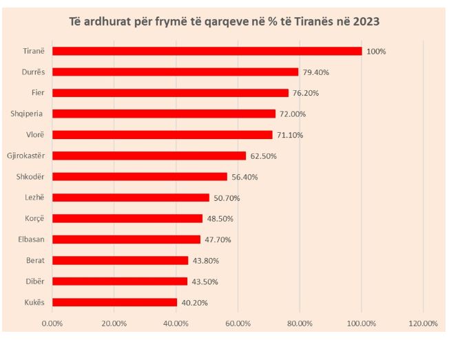 Të dhënat mbi ekonominë e Rajoneve të publikuara së fundmi nga INSTAT që i referohen vitit 2023, tregojnë se, gjysma e qarqeve rreth 5 prej tyre e kishin PBB-në për frymë më pak se gjysma e kryeqytetit.