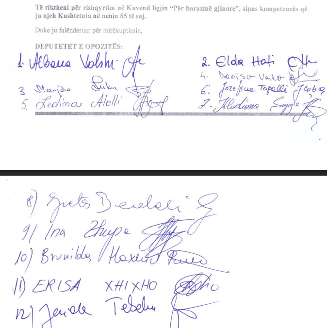 Deputetet e opozitës i janë drejtuar me një kërkesë zyrtare Presidentit të Republikës, që të kthejë për rishqyrtim në Kuvend ligjin për barazinë gjinore. Në kërkesë evidentohen të gjitha argumentet për antikushtetutshmërinë e ligjit.