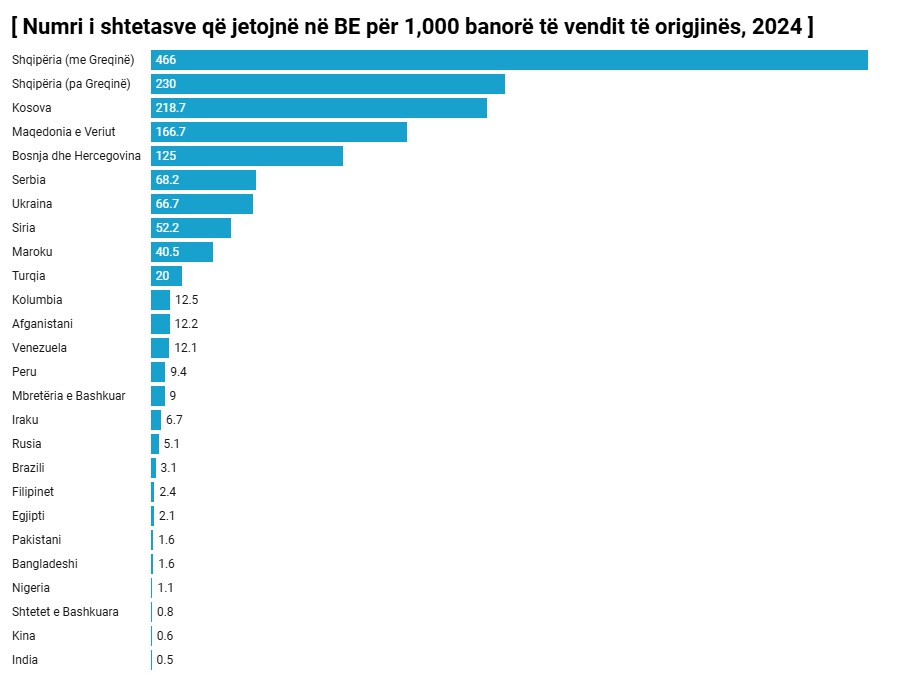 Nëse llogaritet në bazë të popullsisë së mbetur në vendin e origjinës, Shqipëria absolutisht kryeson, madje edhe pa përfshirë të dhënat e Greqisë. Shqipëria me rreth 550 mijë shtetas në BE dhe një popullsi 2.36 milion banorë, arrin rreth 230 shtetas për 1,000 banorë, një shifër shumë më e lartë se çdo vend tjetër në grafik.