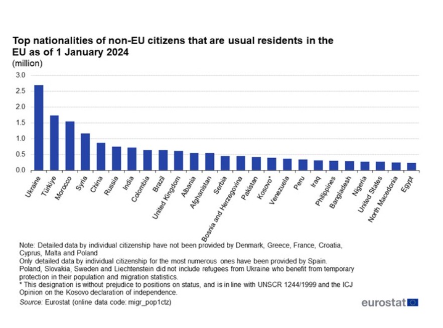 Sipas të dhënave që janë publikuar nga Eurostat, shtetasit shqiptarë u renditën në vend të 11 në grafikun e kombësive kryesore të shtetasve jo të BE-së, që janë rezidentë në BE në vitin 2024, sipas numrit në vlerë absolute.