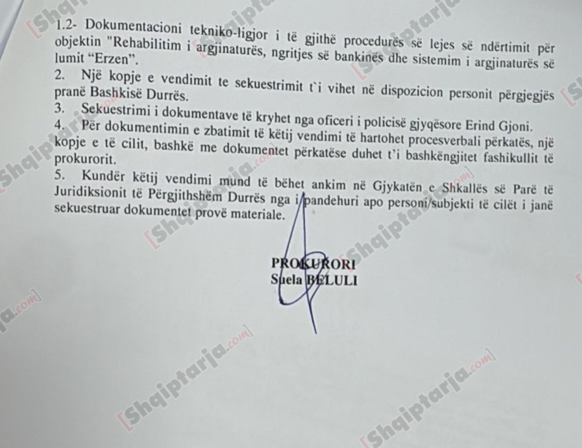 5. Kundër këtij vendimi mund të bëhet ankim në Gjykatën e Shkallës së Parë të Juridiksionit të Përgjithshëm Durrës nga i/pandehuri apo personi/subjekti të cilët i janë sekuestruar dokumentet provë materiale”, thuhet në vendimin e Prokurorisë së Durrësit të firmosur nga prokurorja e çështjes Suela Beluli.