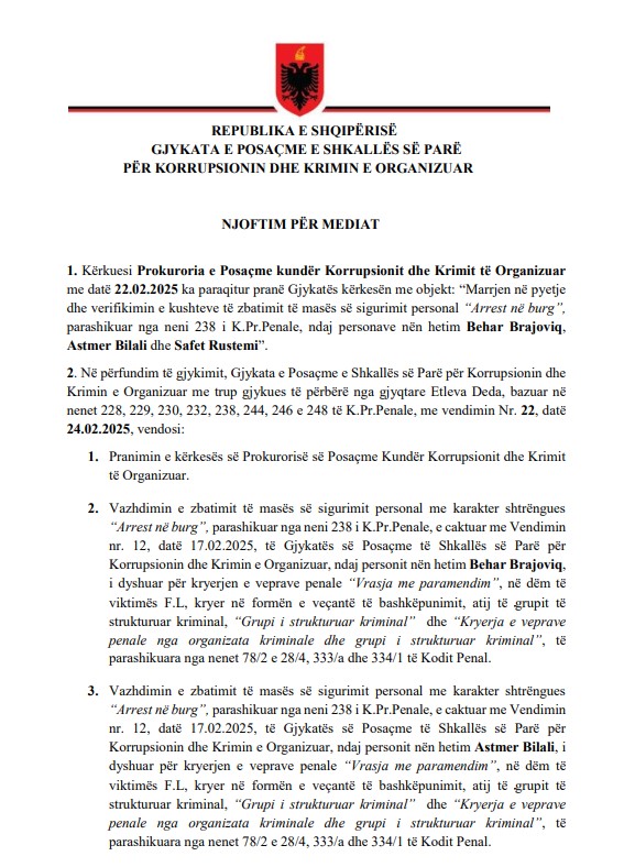 TIRANË- Safet Bajri, i arrestuar me urdhër të SPAK, doli sot para Gjykatës së Posaçme për verifikimin e masës së sigurisë arrest me burg. Në senacën që zgjati rreth 1 orë, gjyqtarja Etleva Deda la në fuqi arrestin me burg. Masa është komunikuar edhe për Astmer Bilalin e Behar Bajrin, por që aktualisht ndodhen në qeli në kuadër të operacioneve “Metamorfoza”.