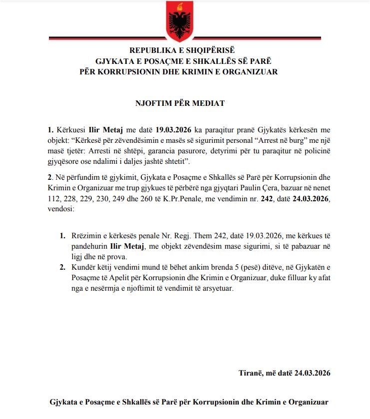 Gjykata e Posaçme kundër Korrupsionit dhe Krimit të Organizuar ka rrëzuar këtë të martë (24 mars), kërkesën e ish-Presidentit Ilir Meta për të lënë qelinë- ditë të cilën ai ka edhe ditëlindjen. Ish-presidenti i cili nuk ishte i pranishëm në seancë kërkoi zëvendësimin e masës kundrejt një garancie financiare prej 50 mijë euro.