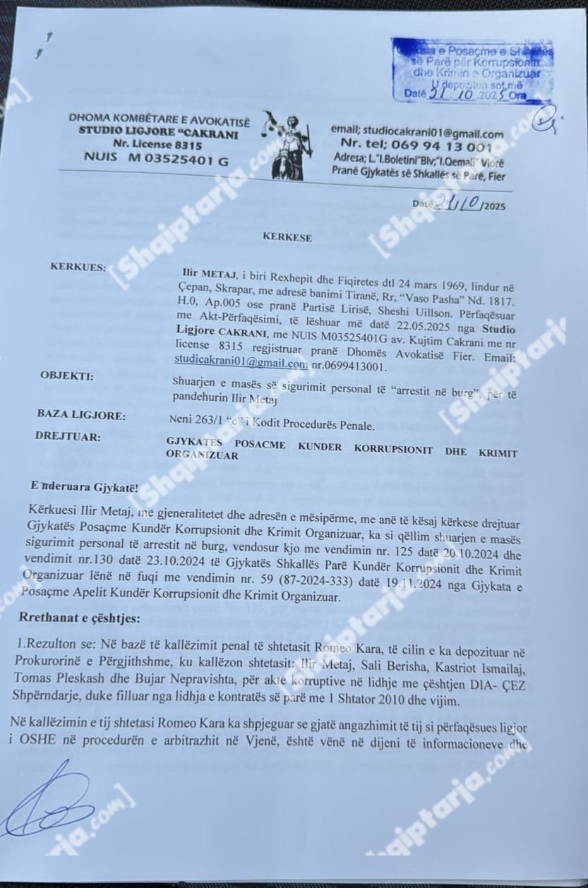 TIRANË- Kreu i Partisë së Lirisë, Ilir Meta i është drejtuar sërish me një kërkesë GJKKO-së, ku kërkon shuarjen e masës së sigurisë arrest me burg. Kërkesa e mbrojtjes së Metës për liri përkon me 1-vjetorin e arrestimit të tij, për aferën CEZ-DIA e skandalin e lobimit të LSI në SHBA.