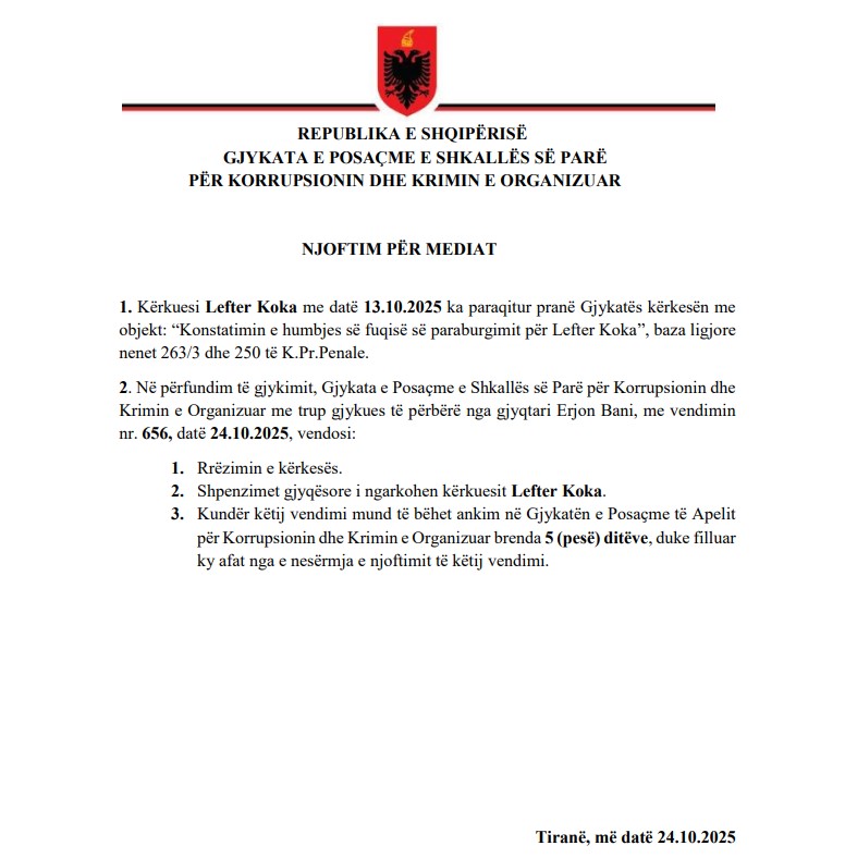 TIRANË- Ish-ministri i Mjedisit, Lefter Koka do të qëndrojë në qeli. Vendimi për inceneratorin e Fierit është pengesa e fundit për Lefter Kokën që të lërë qelinë, por gjyqtari i GJKKO-së, Erion Bani nuk e mori parasysh kërkesën e Kokës për shuarje të masës me pretendimet se ka kaluar afati 3-vjeçar i paraburgimit, maksimali që mund të mbahet dikush në masë sigurie pa një vendim të formës së prerë.