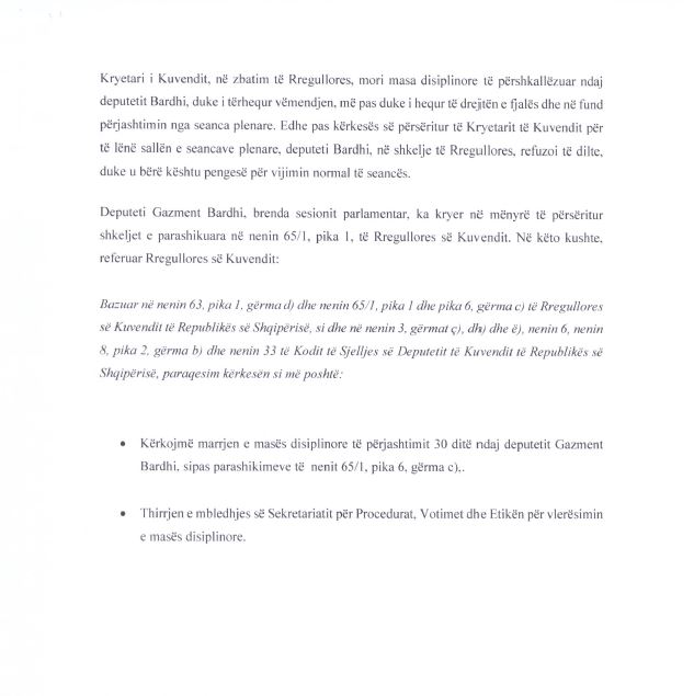 Në kërkesën drejtuar kryeparlamentarit Niko Peleshi, PS pretendon se Bardhi ka thyer në mënyrë të përsëritur Rregulloren e Kuvendit, teksa kërkojnë edhe mbledhjen e Sekretariatit të Etikës për përjashtimit e kreut të Grupit Parlamentar të PD-së.
